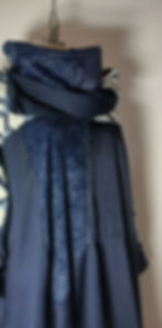 Each piece is born from a dialogue between fabric and form, using deep navy textures that echo the shifting tides of the ocean and the grounding strength of the earth. By layering linen twill, cotton jersey, and sweater knits, I create sculptural garments that feel both organic and architectural—wearable artworks that carry the essence of land and sea. No two designs are ever alike, each one capturing a moment of balance between movement and stillness, fluidity and structure.